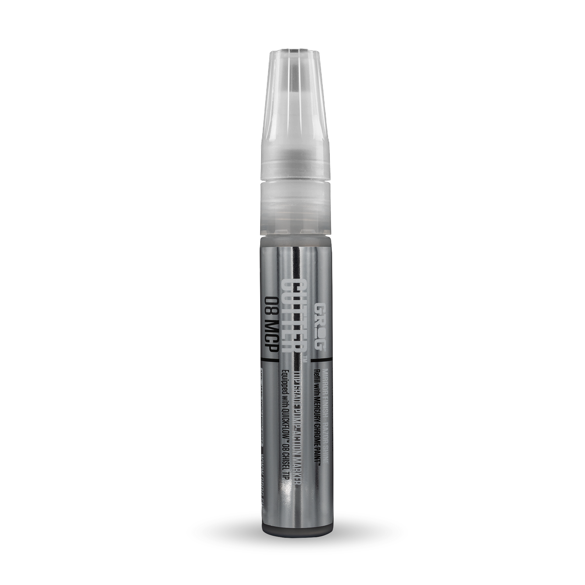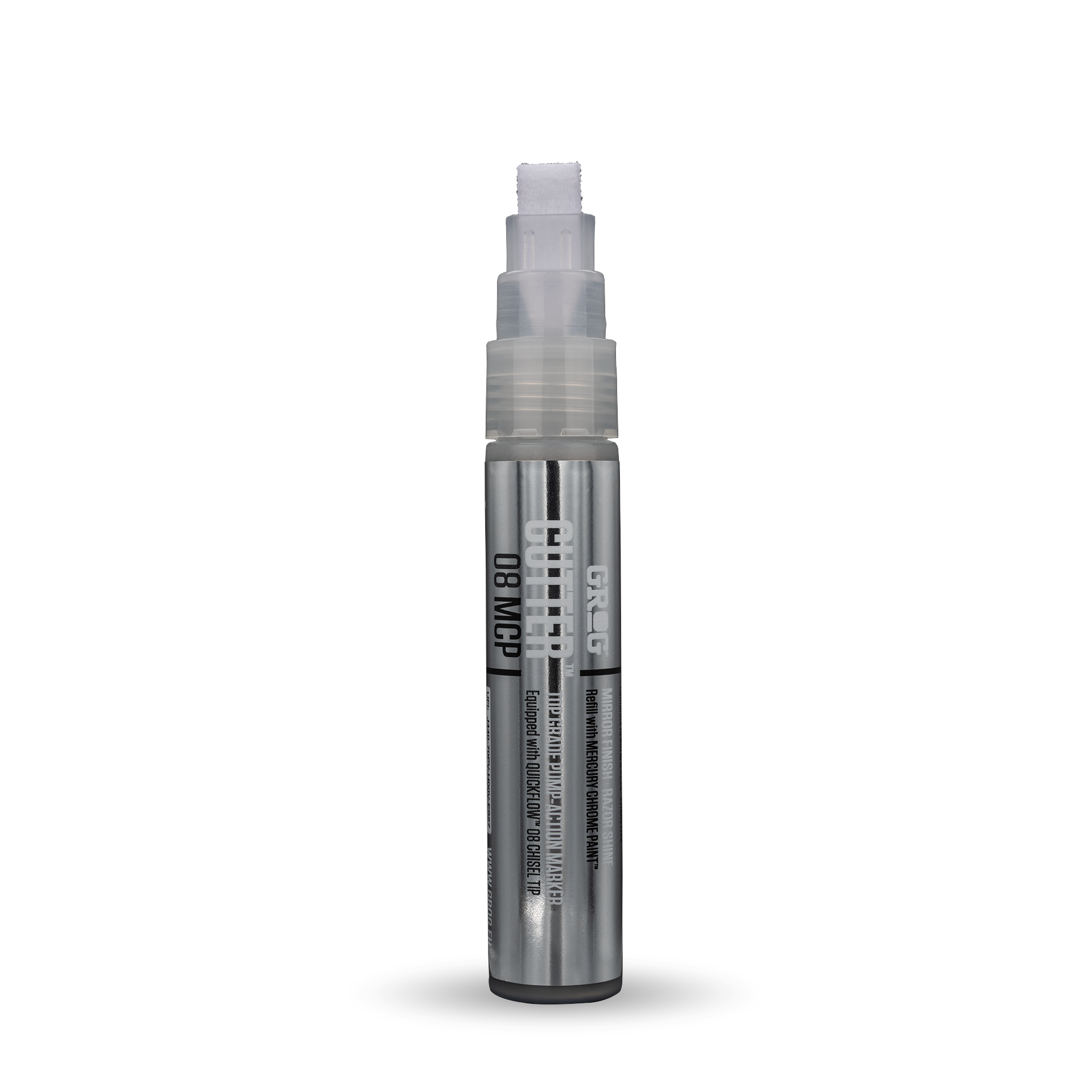 CUTTER 08 MCP is every skilled handstyler’s dream. Its 8 mm polyester QUICKFLOW Chisel Tip can be soaked for juicy tags or kept razor-sharp for precise lines. This compact little gem slides into your pocket with ease—ready to shine wherever you go. Loaded with 20 ml of MERCURY CHROME PAINT, it unleashes an extreme mirror finish on smooth surfaces. The slicker it gets, the bolder the reflection. Refillable for endless action—because you won’t stop.