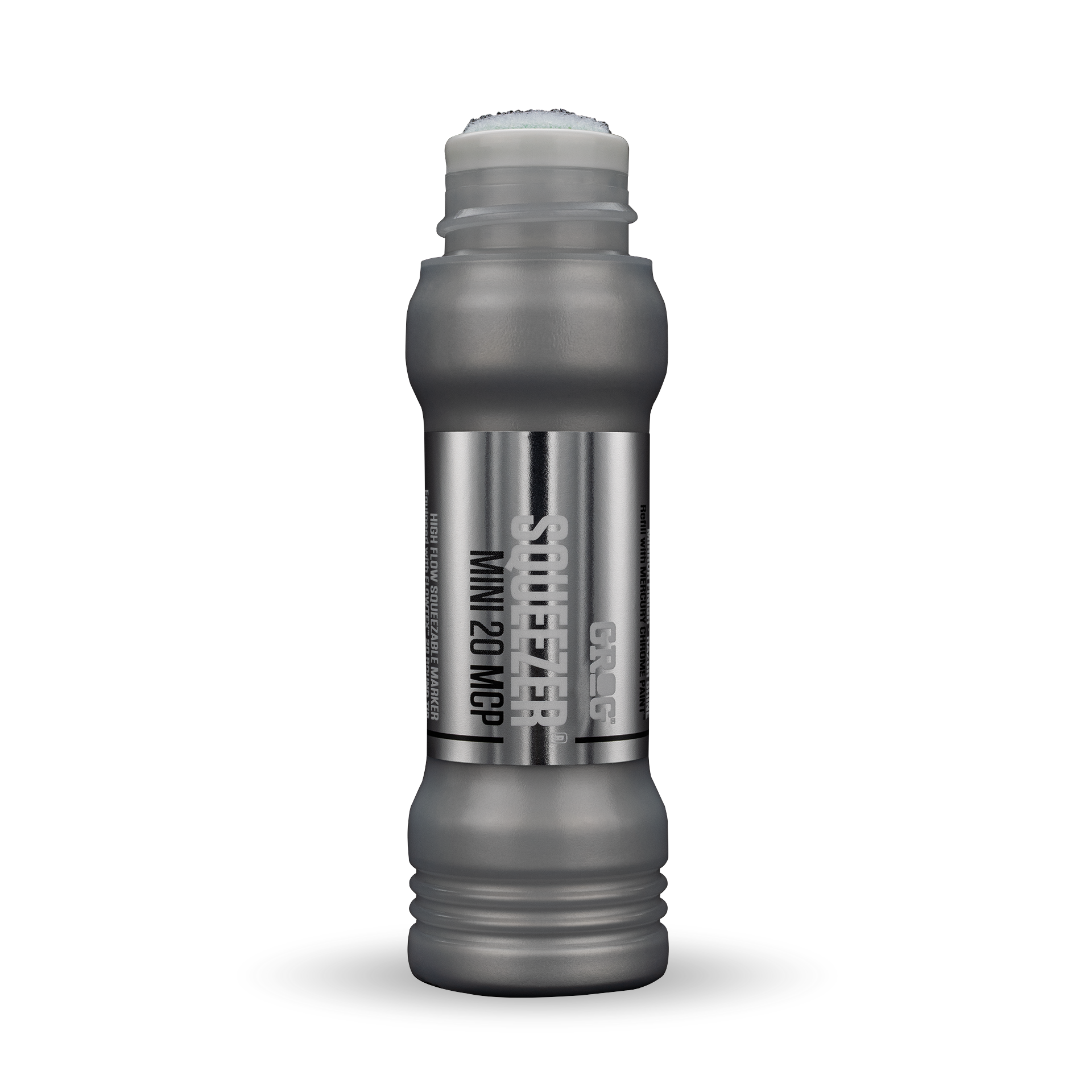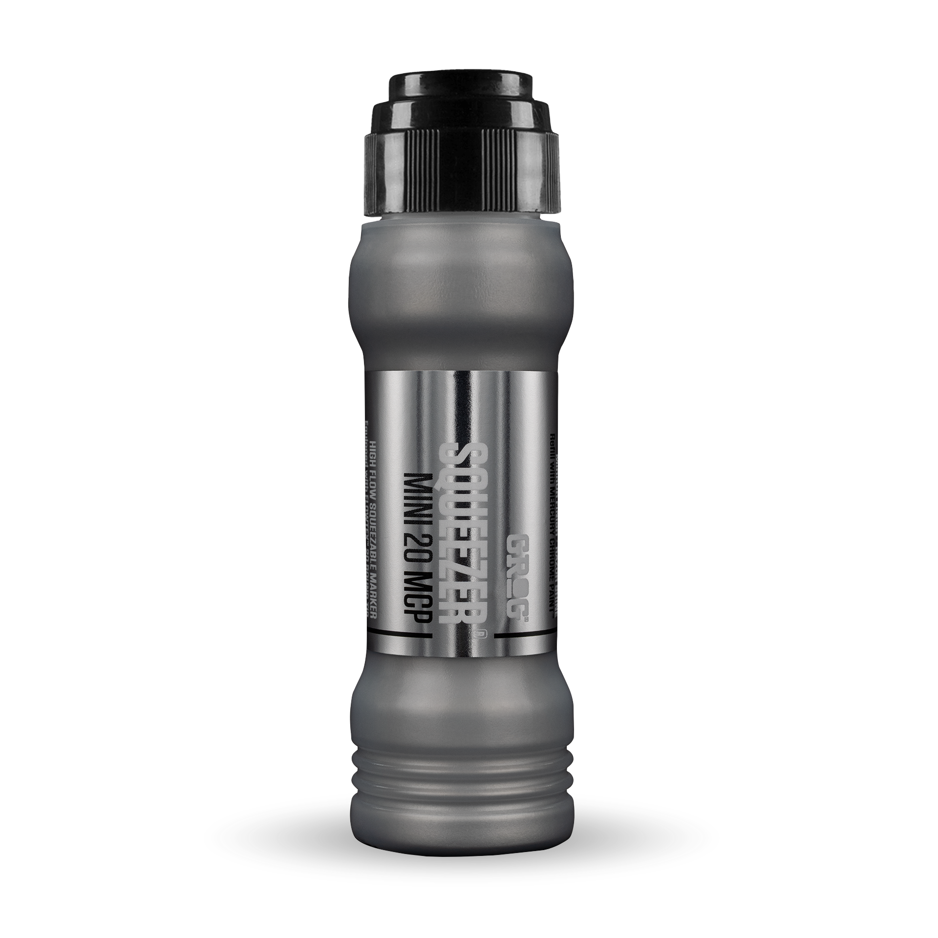 SQUEEZER MINI 20 MCP is always primed for action. Equipped with a 20 mm FLOWTEX Round Tip and a compact, soft body, you can squeeze it mercilessly for unstoppable flow. Preloaded with 50 ml of MERCURY CHROME PAINT, this pocket beast stays discreet yet explodes in a mirror-like blast.